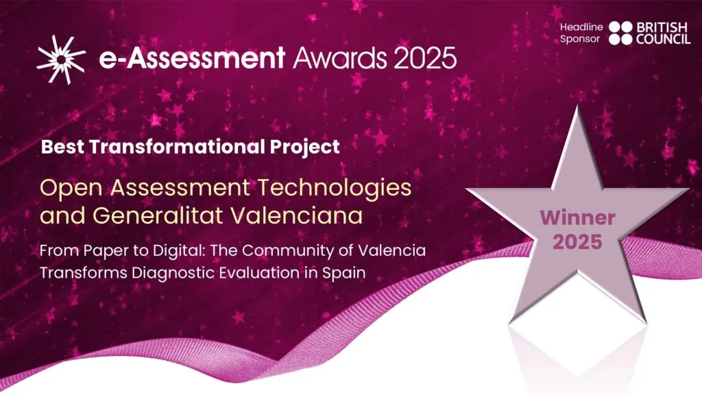 Wir freuen uns, bekannt geben zu können, dass Open Assessment Technologies, zusammen mit unseren inspirierenden Partnern im Bildungsministerium von Valencia, von der e-Assessment Association im Rahmen ihres Preisverleihungsprogramms als Gewinner des Preises für das beste Transformationsprojekt" ausgezeichnet wurde.